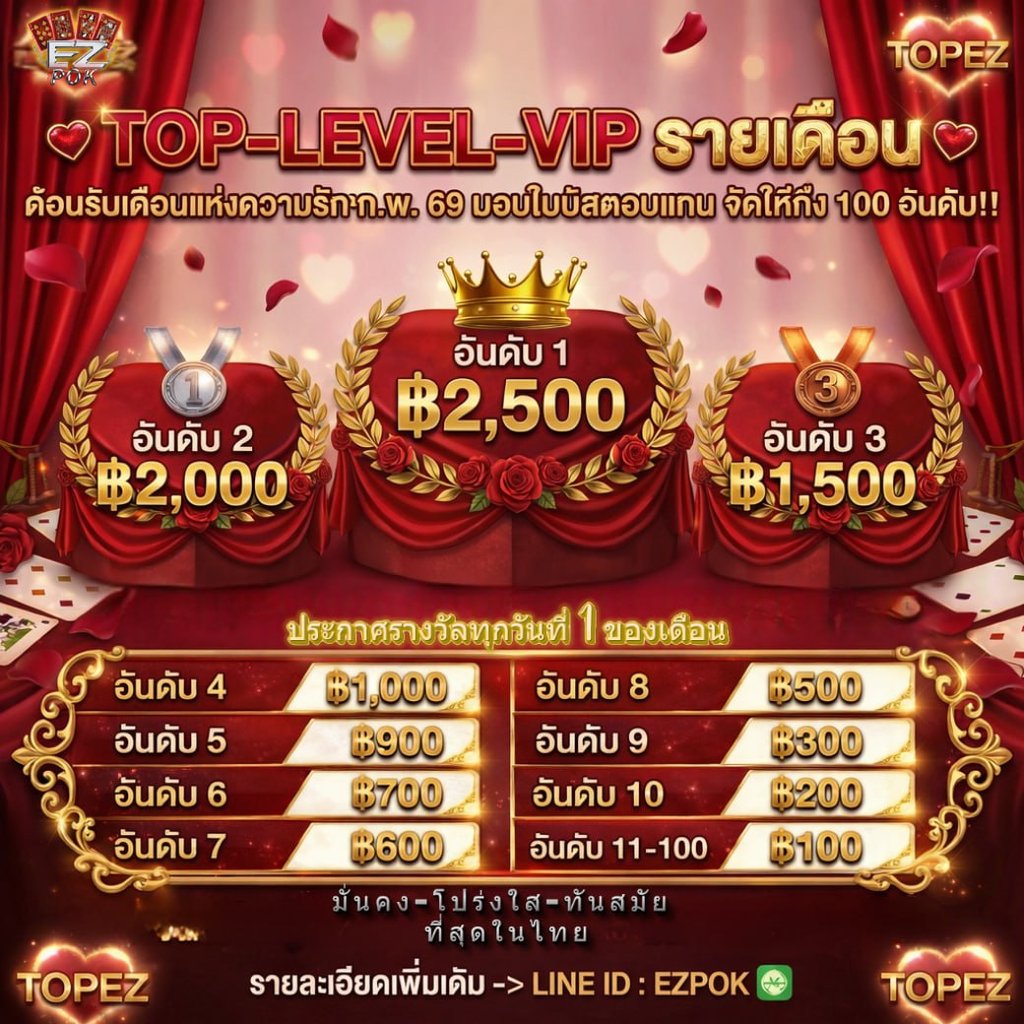 กิจกรรม TOP-LEVEL-VIP รายเดือน รางวัลอันดับ 1: 2,500฿ และรางวัลถึงอันดับ 100 (ตามเงื่อนไข)